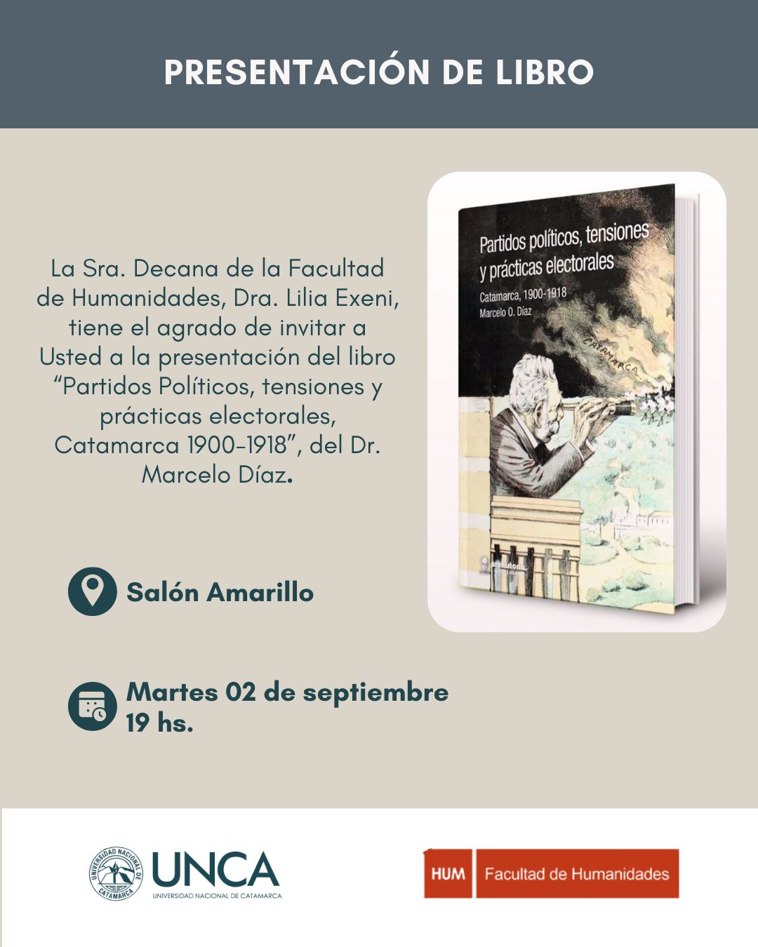 La Facultad de Humanidades de la UNCA, invita a la comunidad a la presentación del libro "Partidos políticos, tensiones y prácticas electorales, Catamarca 1900-1918", del Dr. Marcelo Díaz