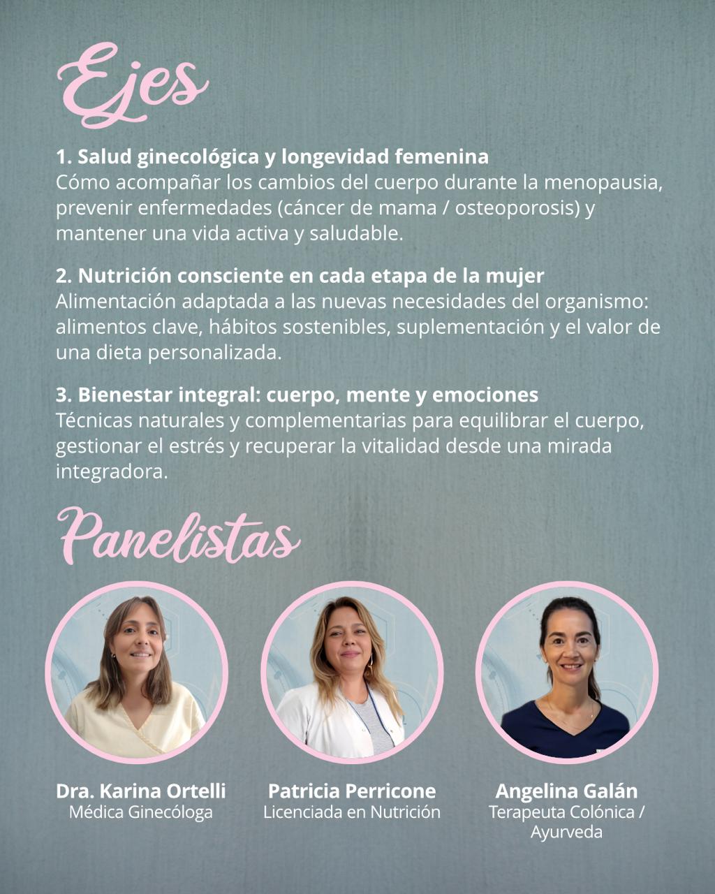 Por último, Angelina Galán, terapeuta colónica y especialista en Ayurveda, brindará una mirada complementaria desde la medicina integrativa, centrada en el bienestar del cuerpo, la mente y el espíritu.